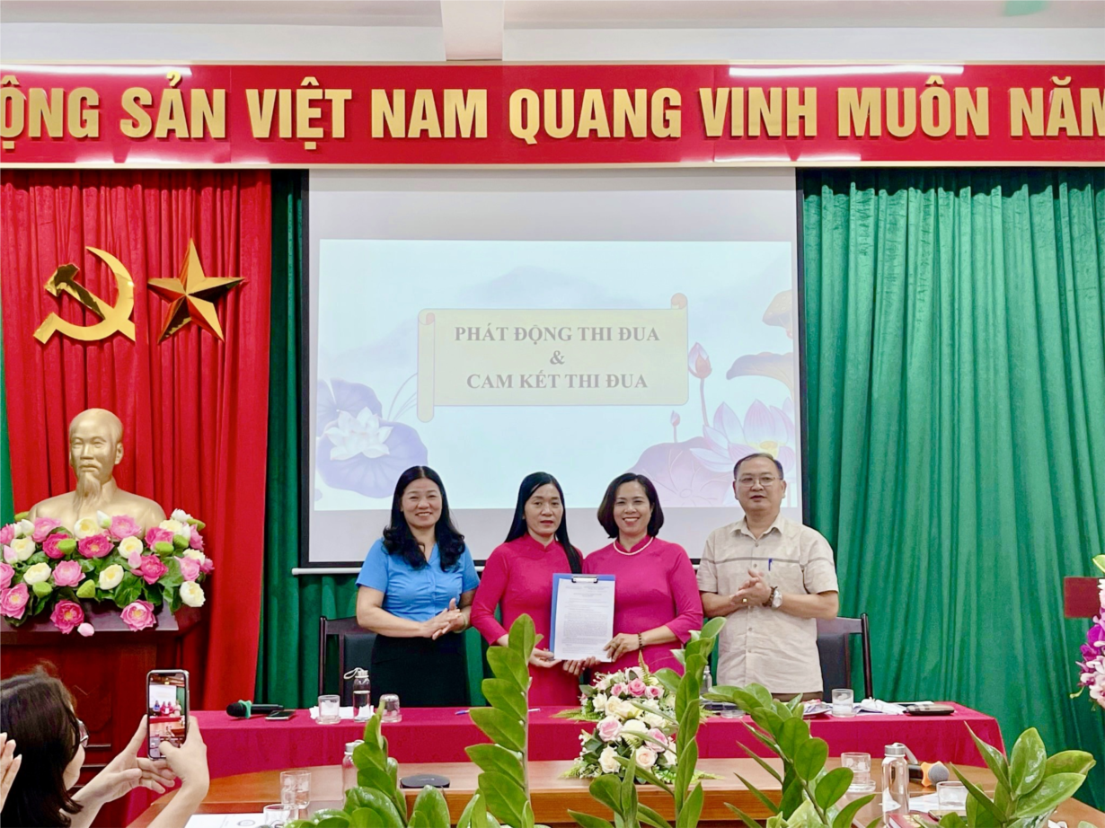 Đồng chí Trần Thị Thuý - Chủ tịch Công đoàn phát động phong trào thi đua, nội dung giao ước thi đua năm học 2023-2024.Tập thể CBGVNV đã chứng kiến đ/c Hiệu trưởng và đ/c Chủ tịch công đoàn ký giao ước thì đua giữa Ban giám hiệu và Ban chấp hành công đoàn năm học 2023-2024.