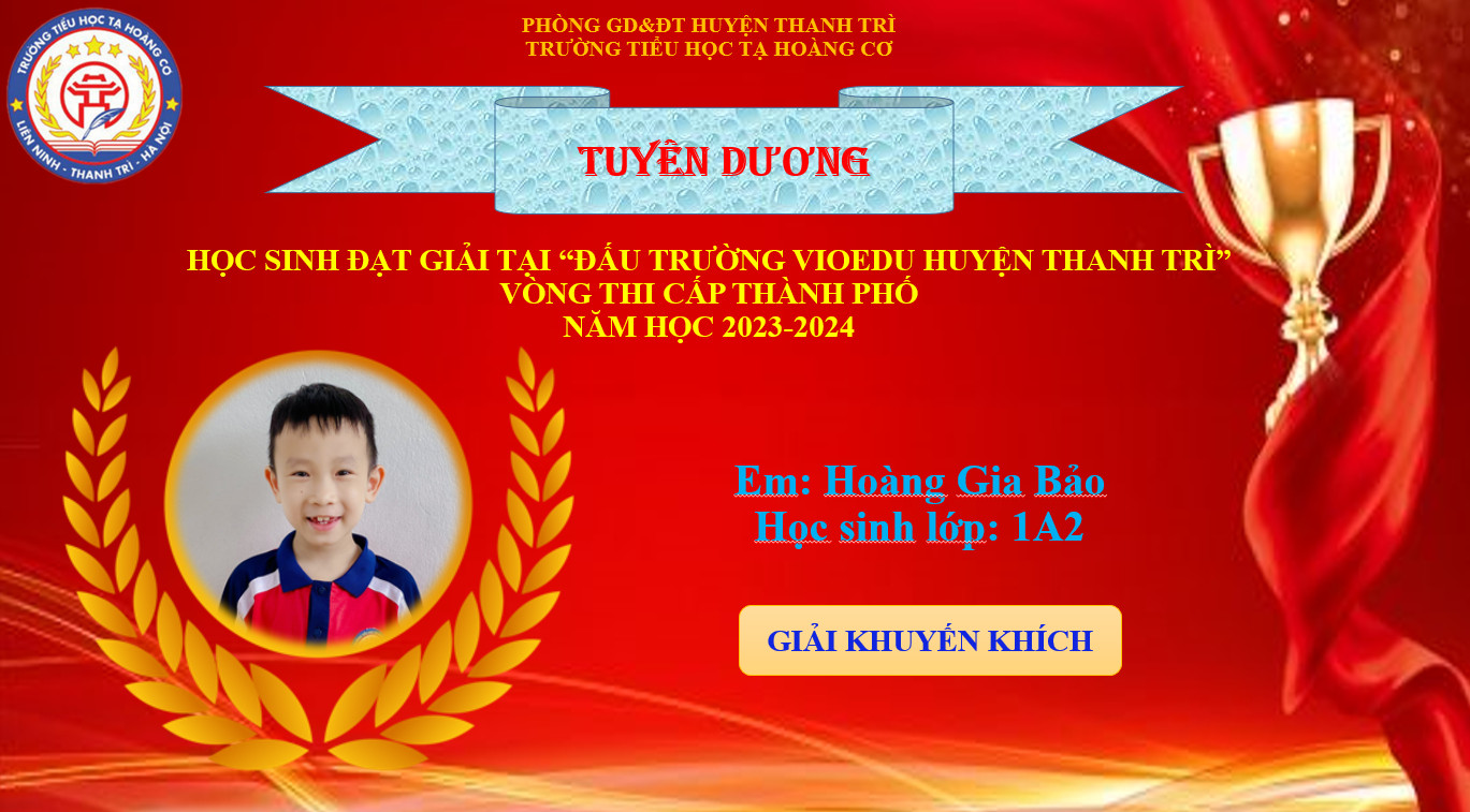 🎉💐Chúc mừng con Nguyễn Gia Bảo học sinh lớp 1A2 trường Tiểu học Tạ Hoàng Cơ đã xuất sắc đạt giải Khuyến Khích trong sân chơi Đấu trường VioEdu cấp Thành phố năm học 2023-2024.