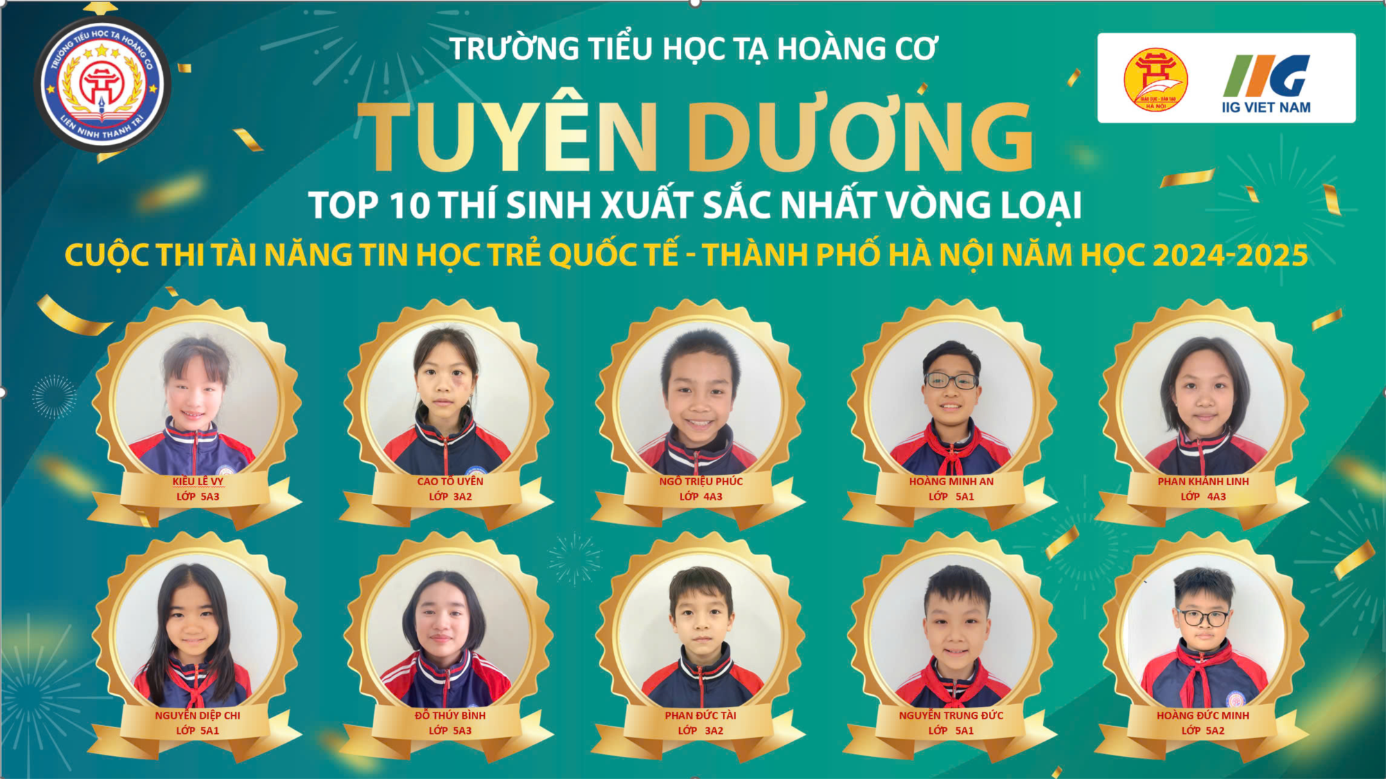 Trường Tiểu học Tạ Hoàng Cơ xin chúc mừng TOP 10 thí sinh xuất sắc nhất vòng loại của Cuộc thi Tài năng Tin học Trẻ Quốc tế – Thành phố Hà Nội năm học 2024-2025!