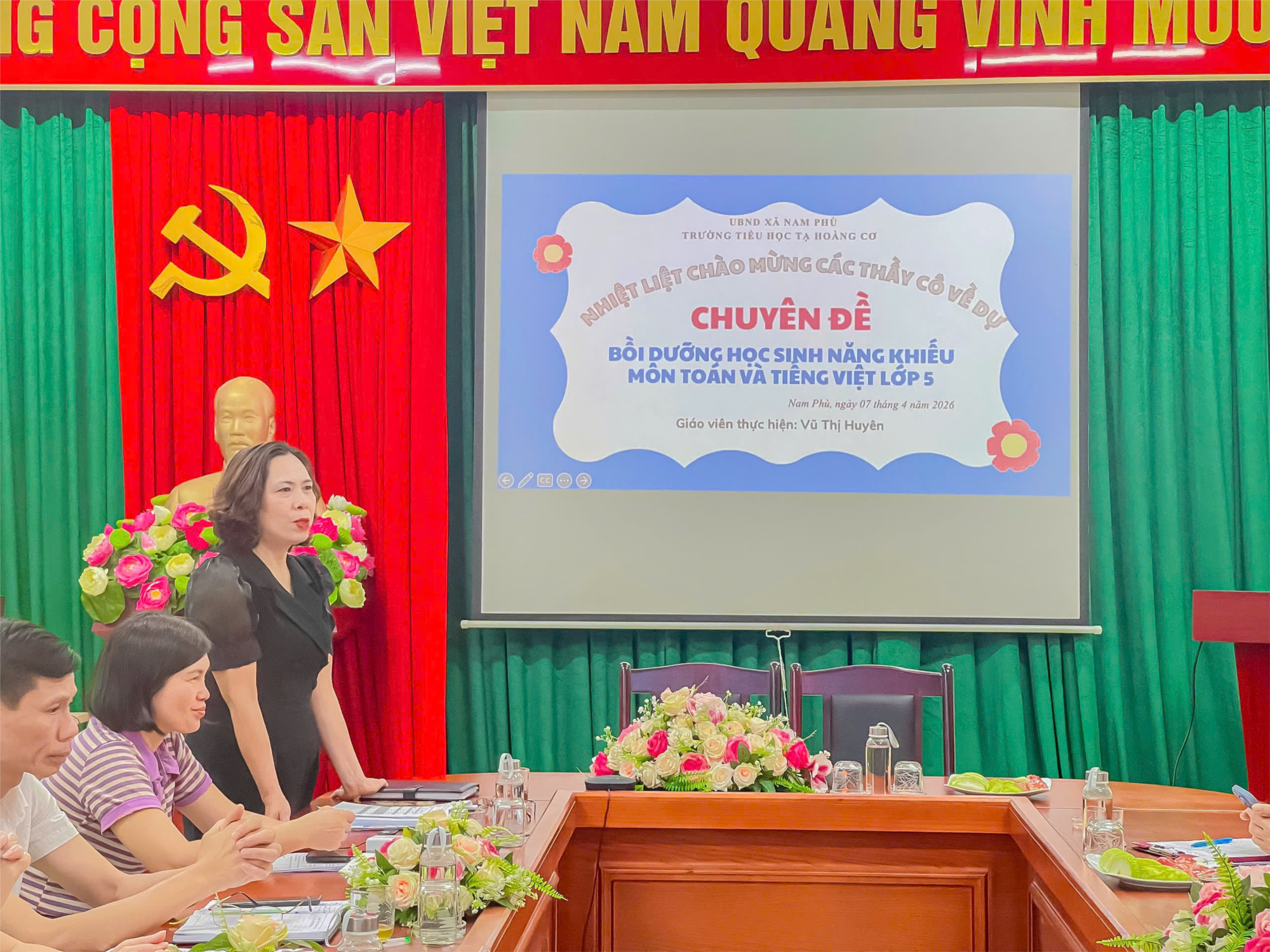 Nhằm nâng cao chất lượng giáo dục mũi nhọn và phát hiện, bồi dưỡng học sinh có năng khiếu, được sự chỉ đạo của Phòng Văn hoá - Xã hội xã Nam Phù, sáng ngày 07/04/2026, Trường Tiểu học Tạ Hoàng Cơ đã tổ chức chuyên đề “Bồi dưỡng học sinh năng khiếu lớp 5 môn Toán và Tiếng Việt”. Chuyên đề do cô giáo Vũ Thị Huyên trình bày đã thu hút sự quan tâm, tham gia của các thầy cô giáo lớp 5 trên địa bàn xã và đông đảo cán bộ, giáo viên trong nhà trường.